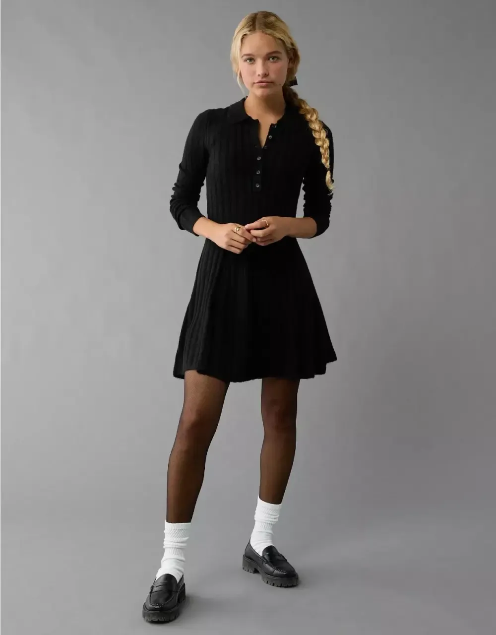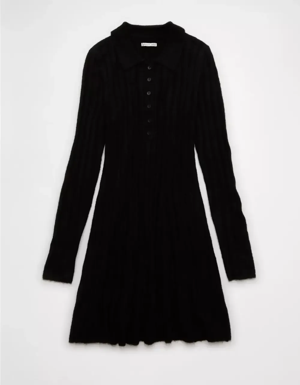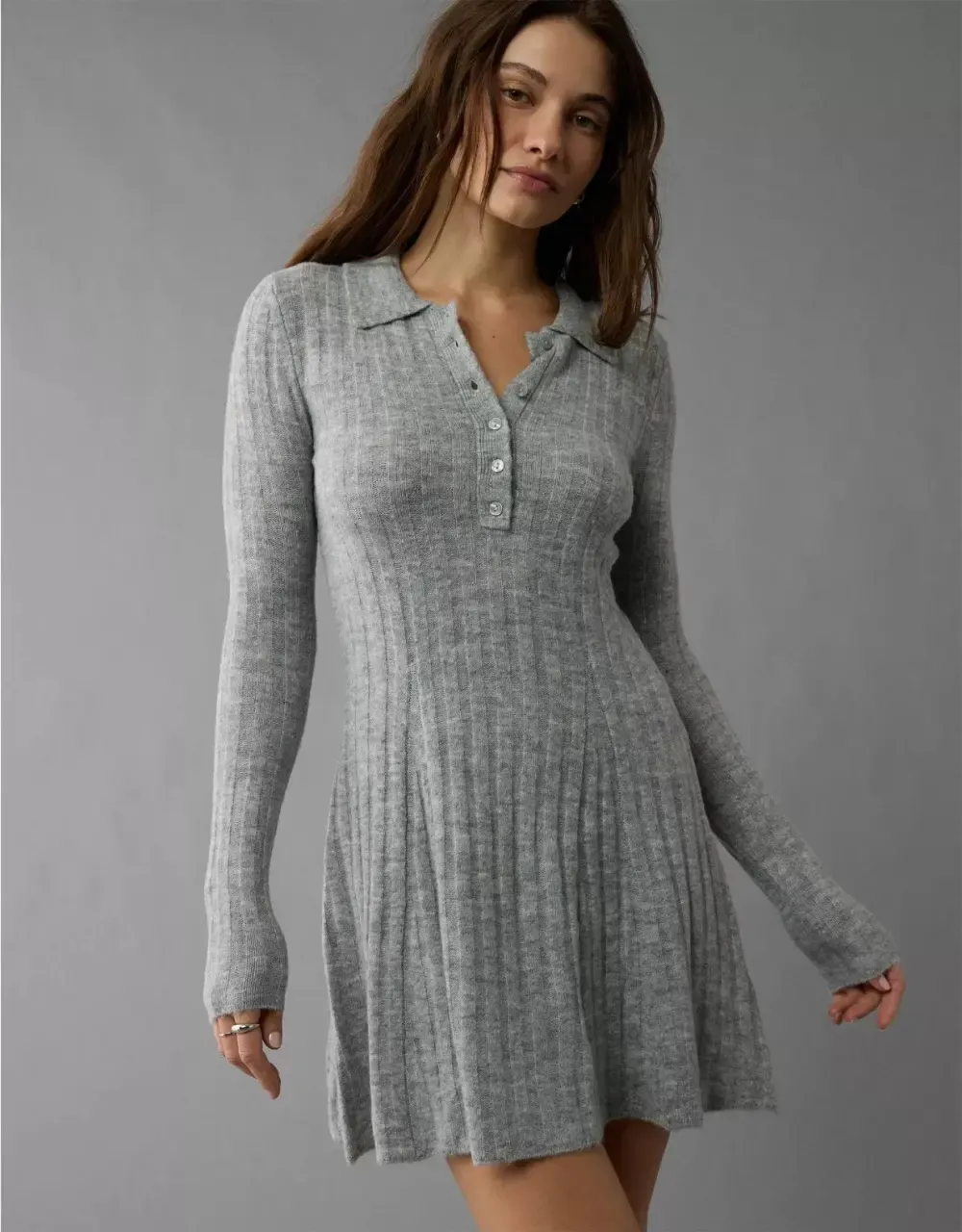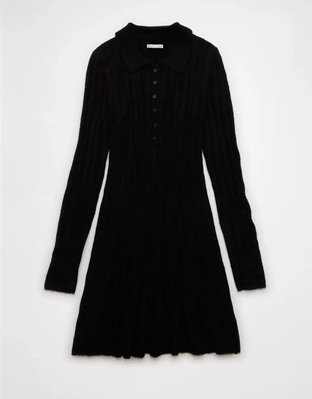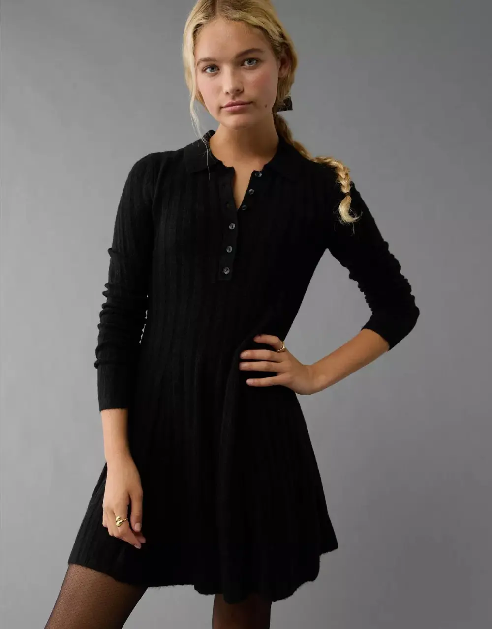Ae Long-Sleeve Polo Mini Sweater Dress