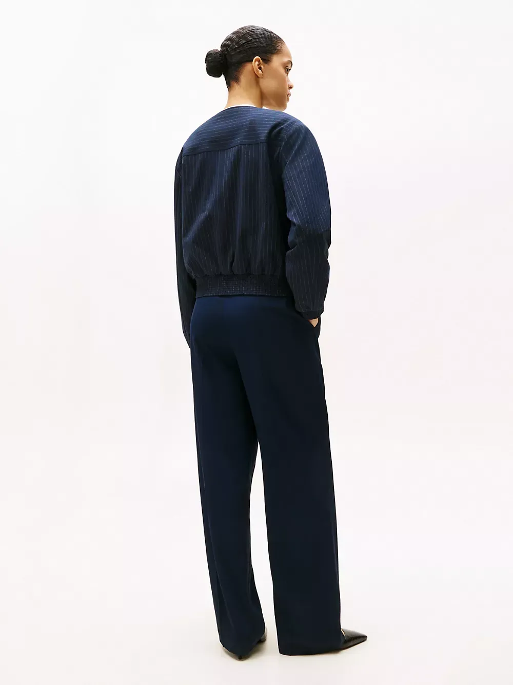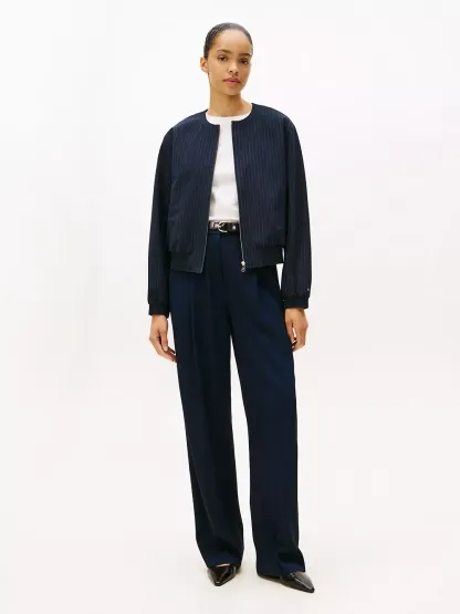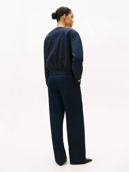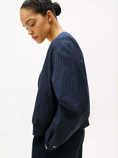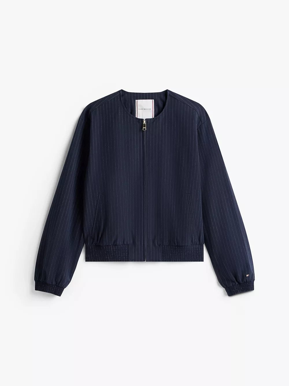 Tommy Hilfiger women's jacket. Our flattering bomber is made from a stretchy, midweight blend with a soft, smooth feel. This versatile piece features side welt pockets, a shirred hem and a collarless neckline for a clean finish.