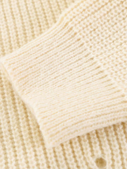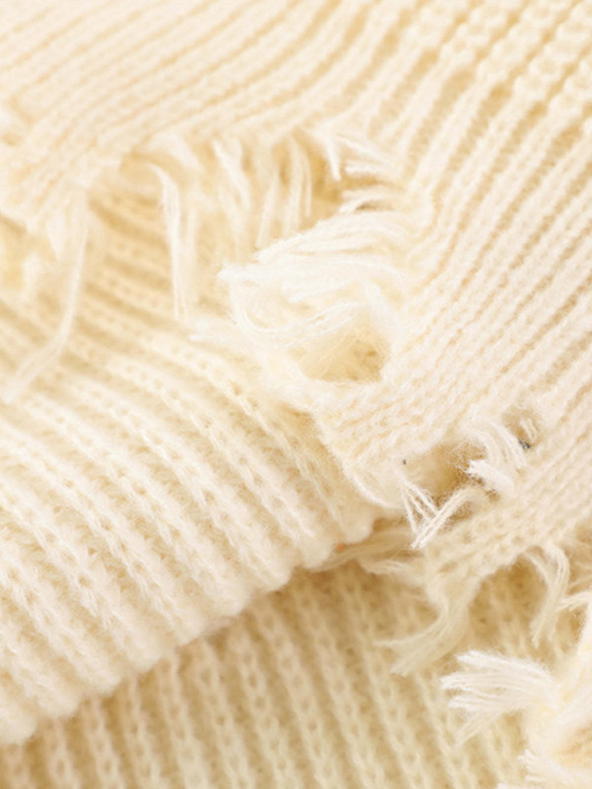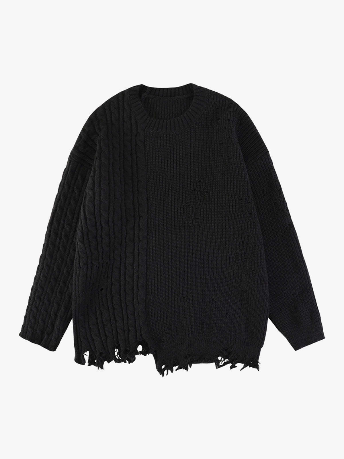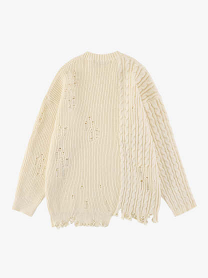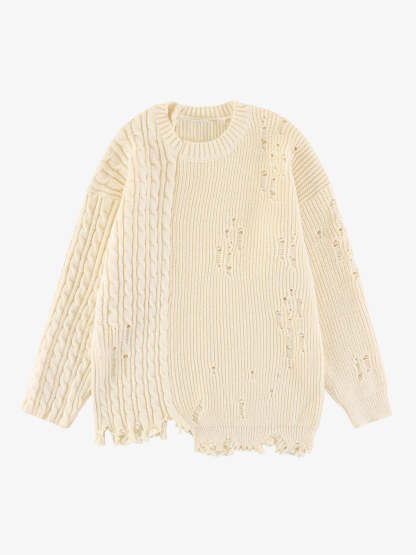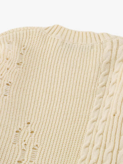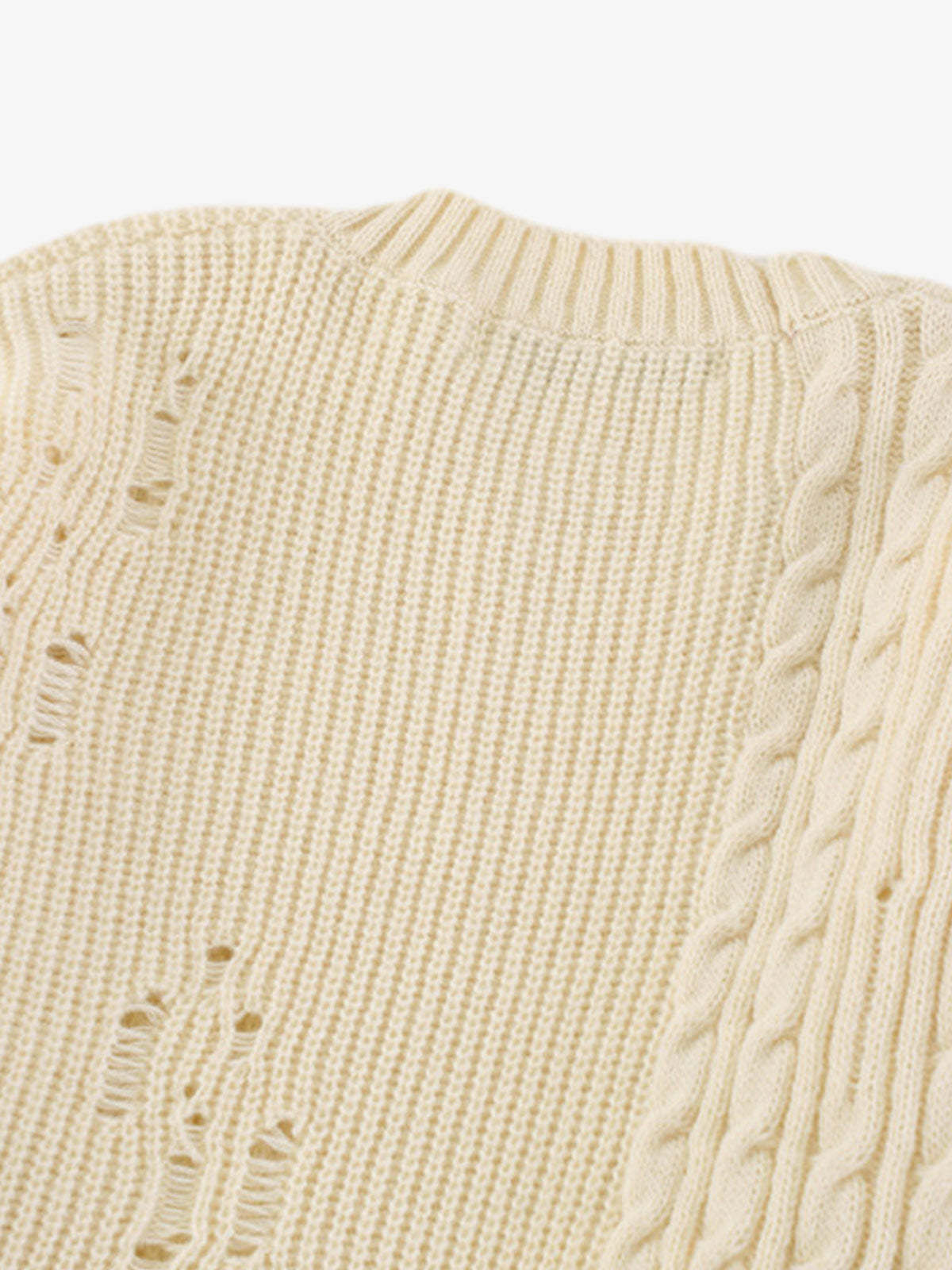 • Design Elements: Cable knit sleeves, distressed details along the hem and sides, ribbed cuffs and neckline