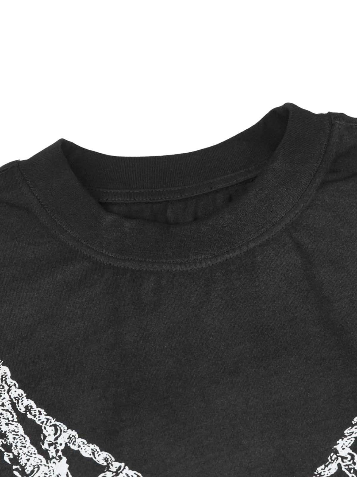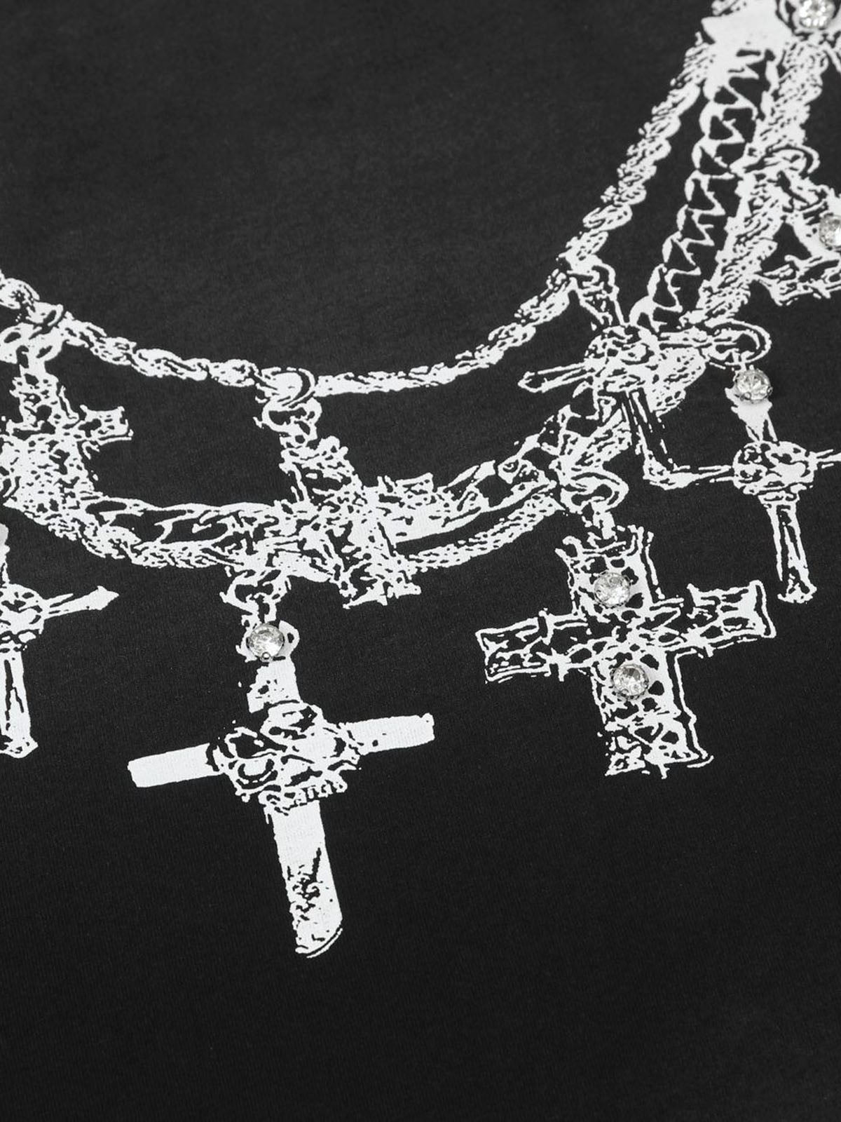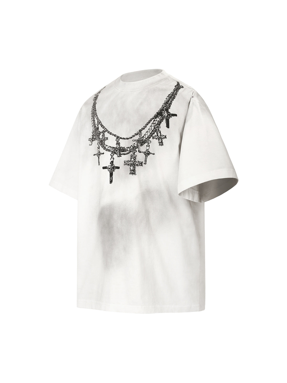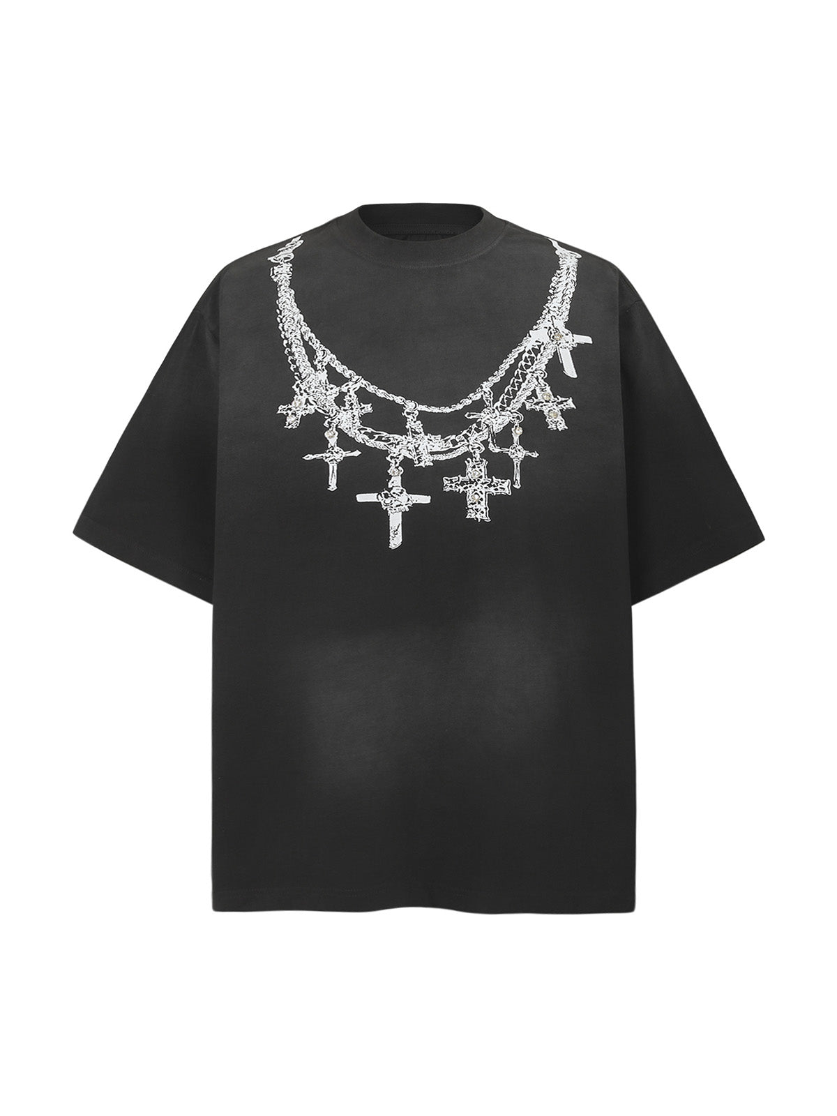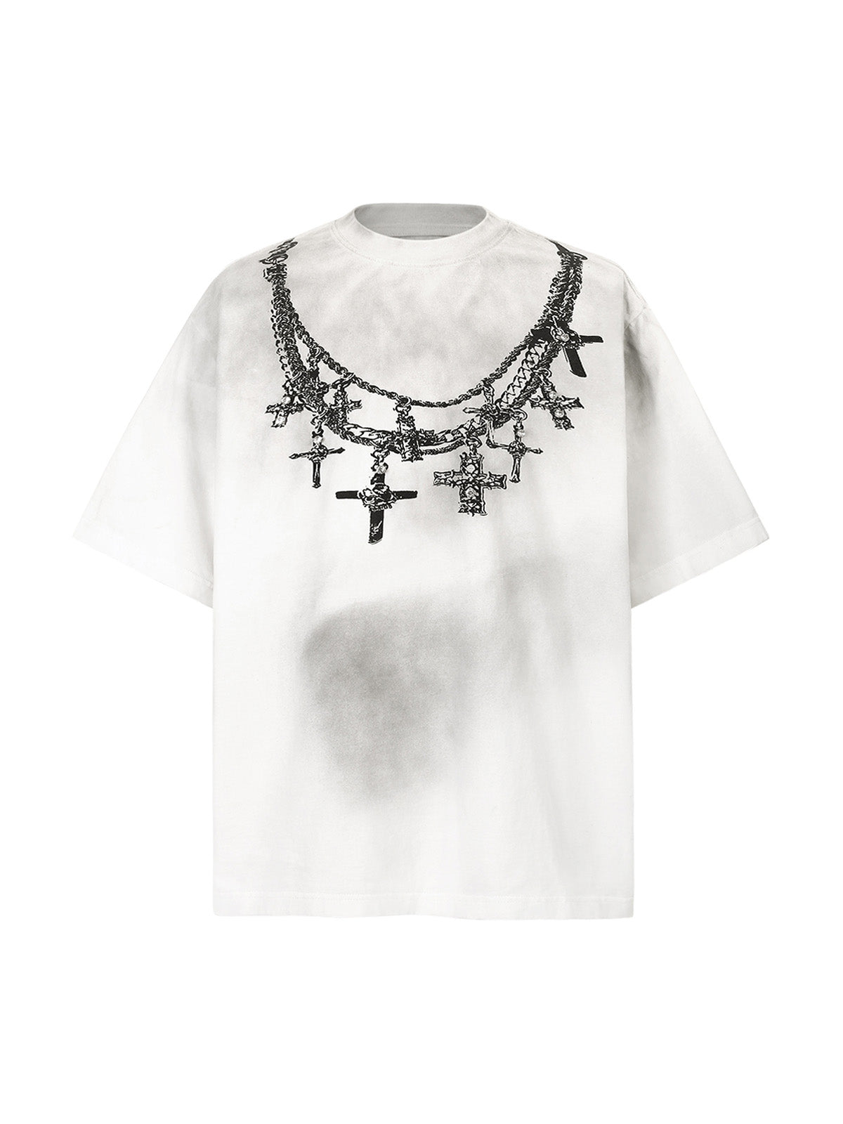 • Design Elements: Bold cross necklace graphic print, distressed effect, gradient dyeing