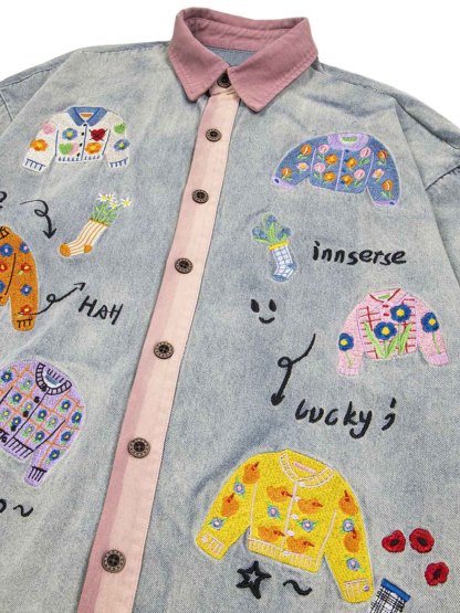 • Design Elements: Vibrant embroidered sweater patches, playful text details, and floral accents
