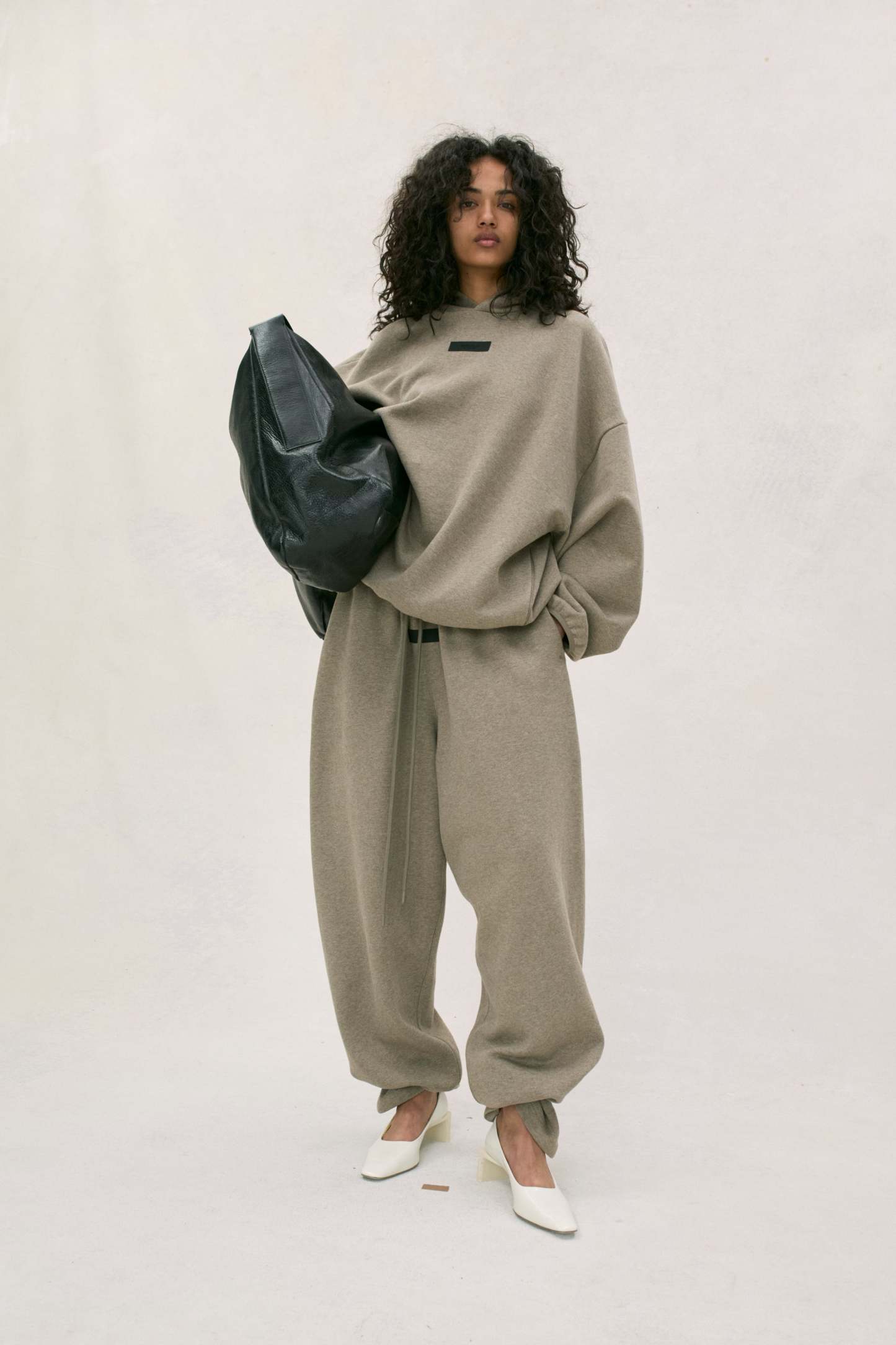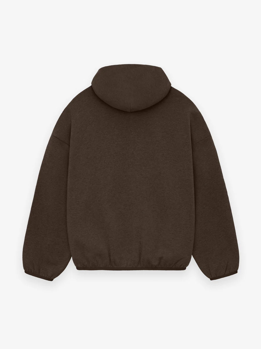 The hoodie is made in core fleece and designed with volume to create a round, cropped silhouette. Details include an overlapped neckline, side seam pockets, elastic binding at the cuff, and waist hem. New minimalist branding is seen in the rubberized black bar on the center front.