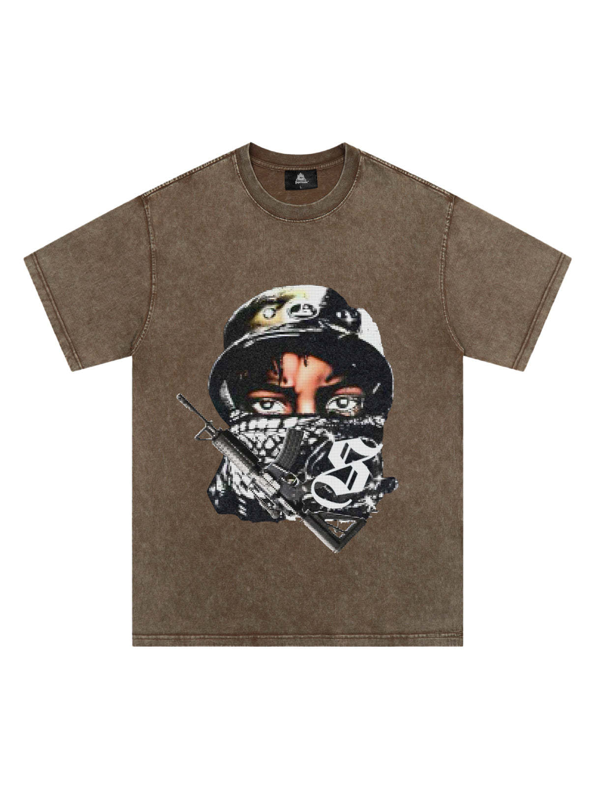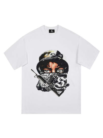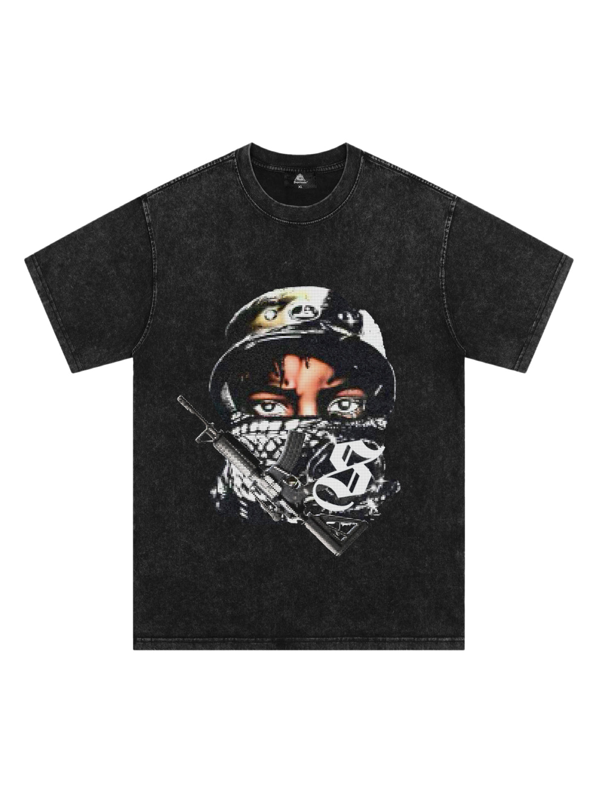 • Design Elements: Bold graphic print featuring a soldier with a bandana and weapon, pixelated effect for modern appeal