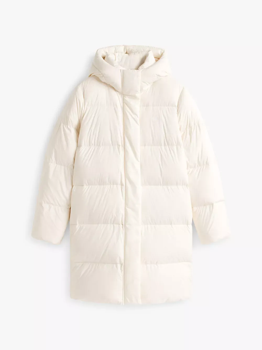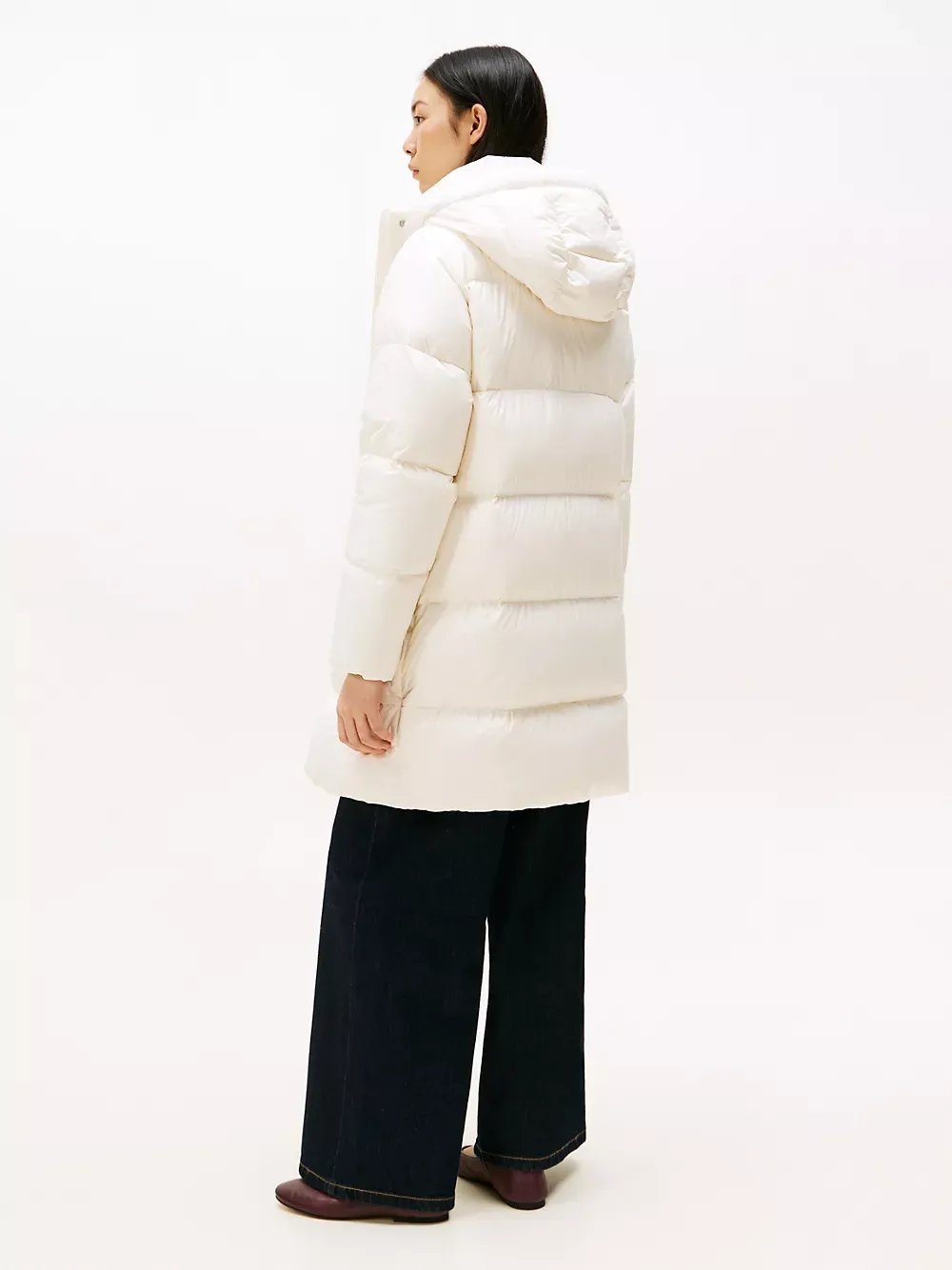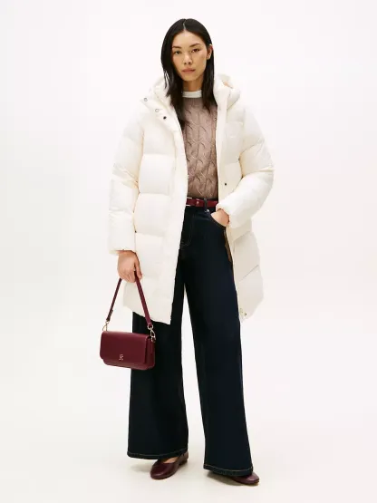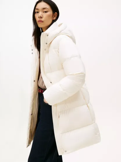 Tommy Hilfiger women's coat. Heritage style meets contemporary construction in this puffer coat, made chill-proof thanks to the down insulation, a high funnel neck and a fixed hood. This iteration is designed in a midi silhouette, intended to finish close to the top of the knee.