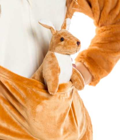 What's the cutest thing to come out of Australia besides Hugh Jackman? The women's kangaroo costume, of course! * Our adult kangaroo costume provides a cute and fluffy alternative to cumbersome two-man horse costumes, plus it comes with its very own baby kangaroo to get tongues wagging at your next Halloween party. This charming kangaroo costume comes with its very own tail and set of fluffy ears to make your guests swoon. Plus, while its main function is to serve as a kangaroo costume, it's also got convenient hand and feet holes, helping you pull it on as easily as a pair of pajamas. Go hopping around Halloween parties by night or simply lounge around the house by day in this funky jumpsuit. Just make sure you don't have a beer in your hand if you're feeling particularly bouncy. *We cannot verify that this product was, in fact, made down under.