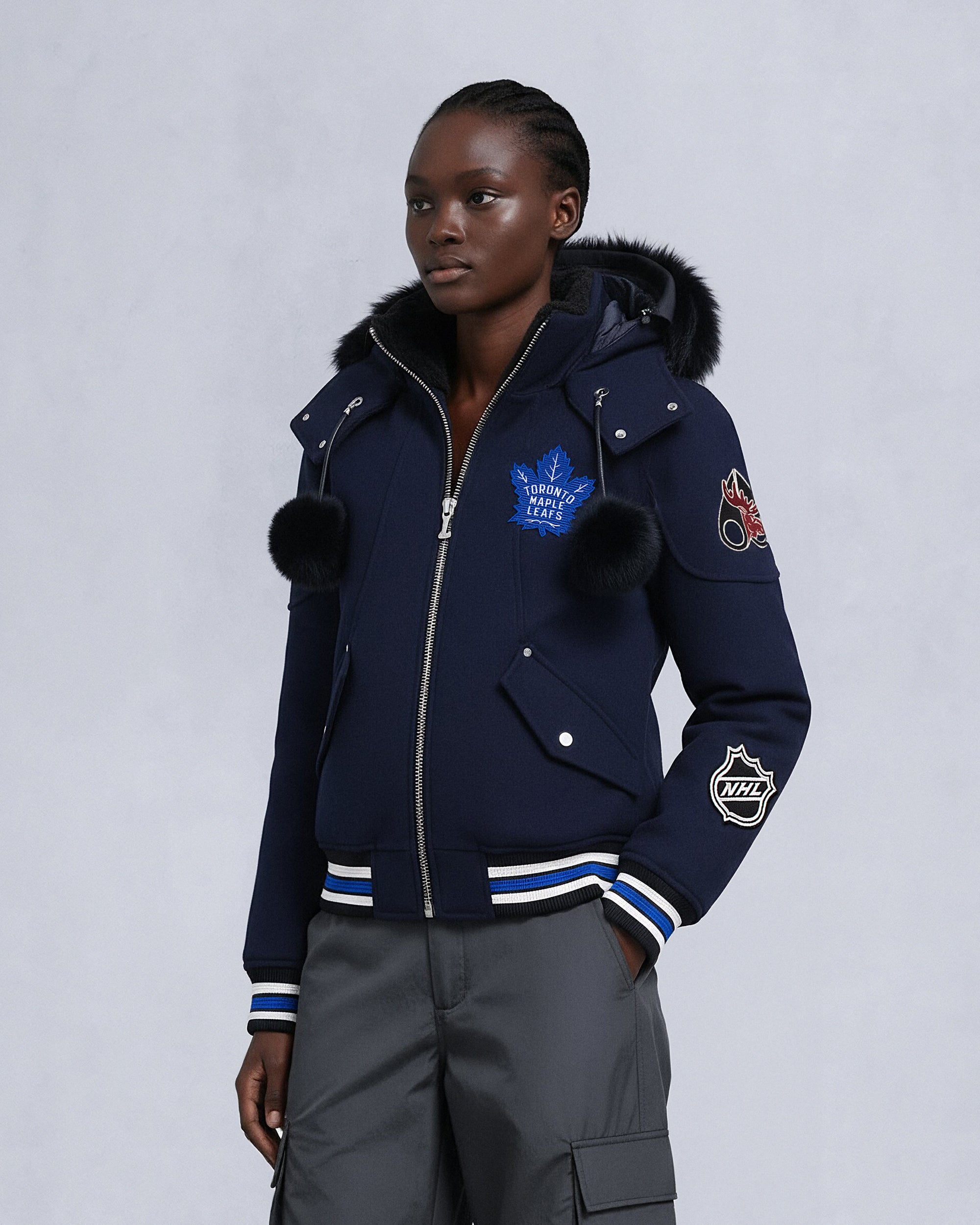 Celebrate the Toronto team with the exclusive NHL x Moose Knuckles Maple Leafs Bomber. High-performance engineering and cozy warmth meet hometown pride in this piece, which features the team's classic blue colorway.