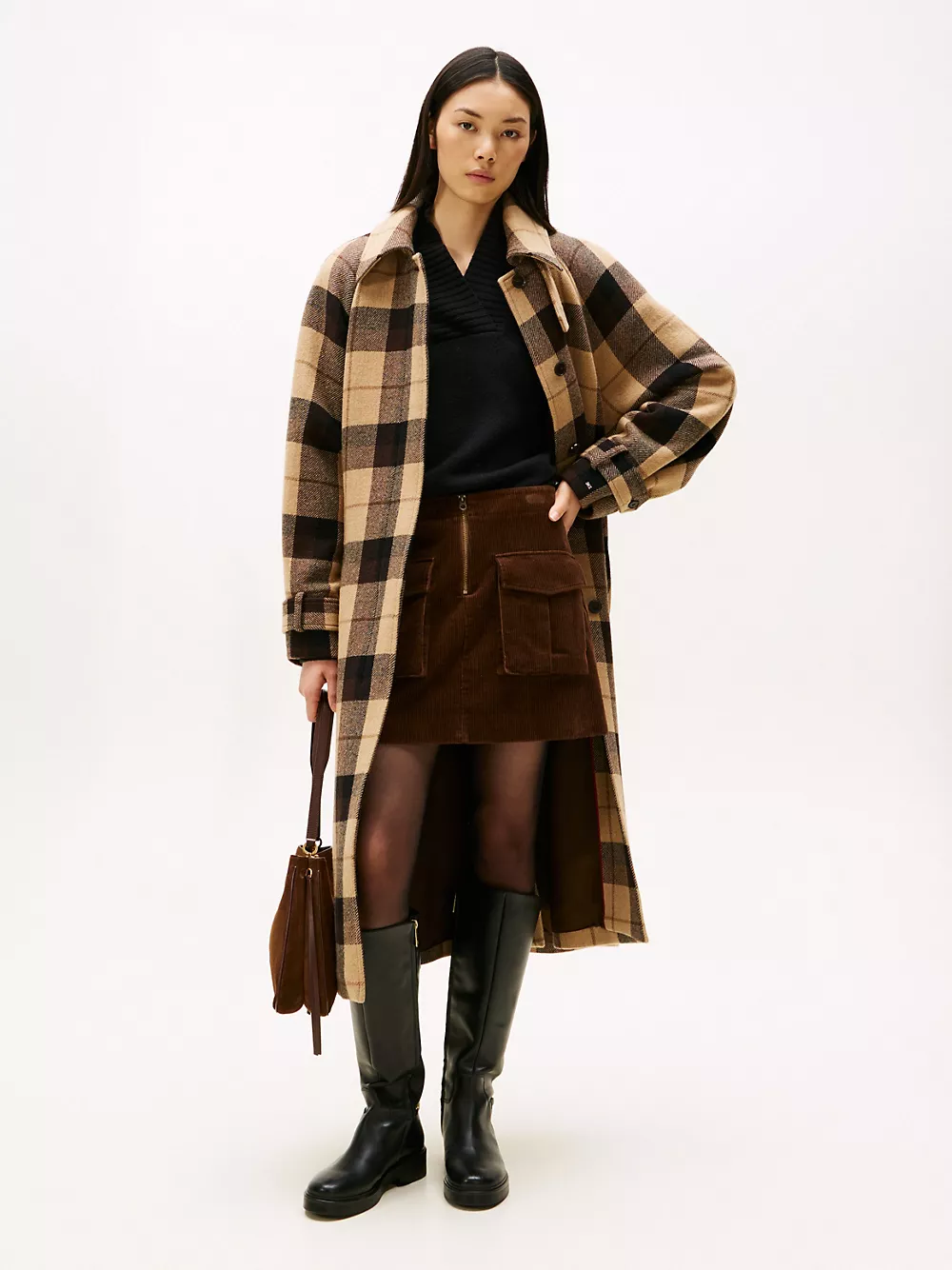 Tommy Hilfiger women's coat. Stand out from the sea of black outerwear with our bold plaid print coat, made from a wool-cashmere blend for extra softness. It's cut with a comfortably oversized fit that can easily be adjusted at the waist with a detachable belt.