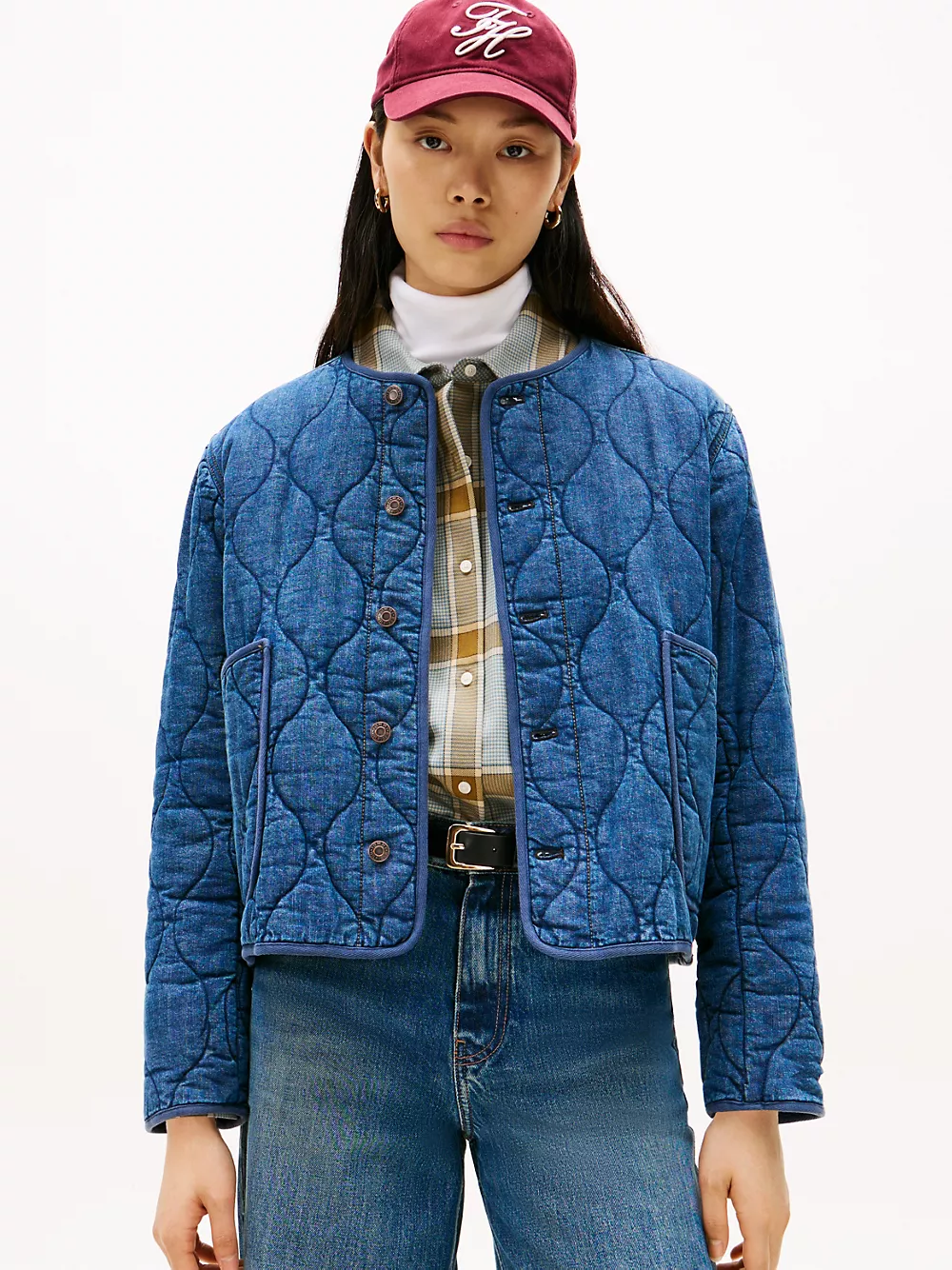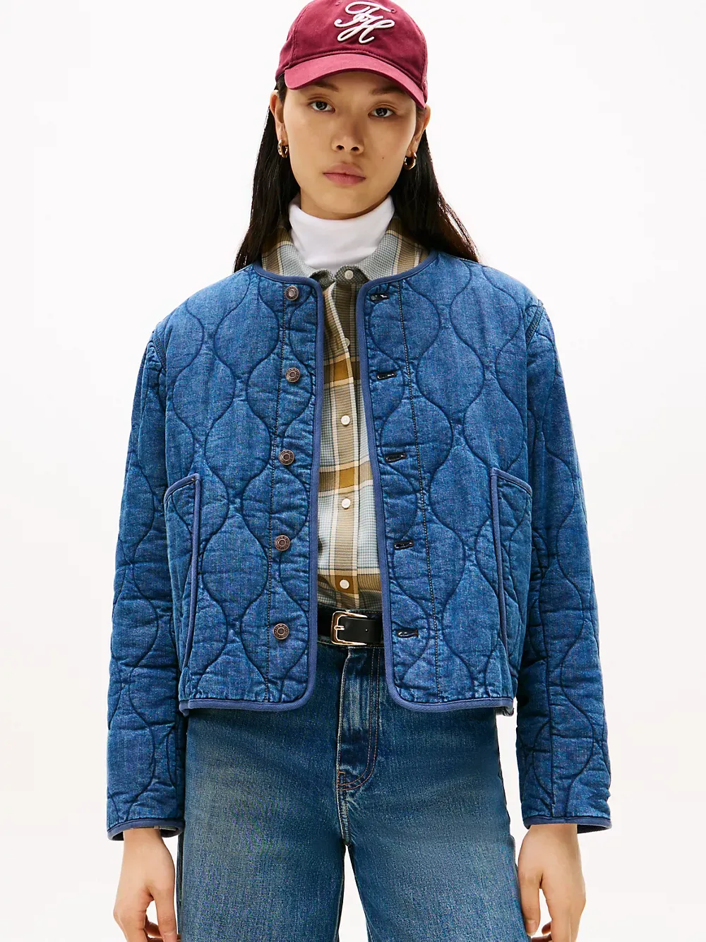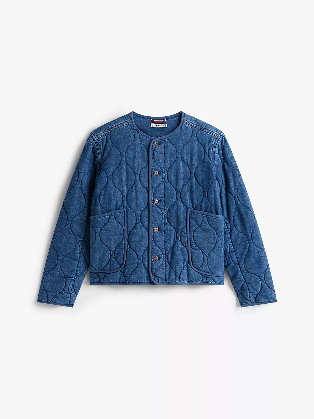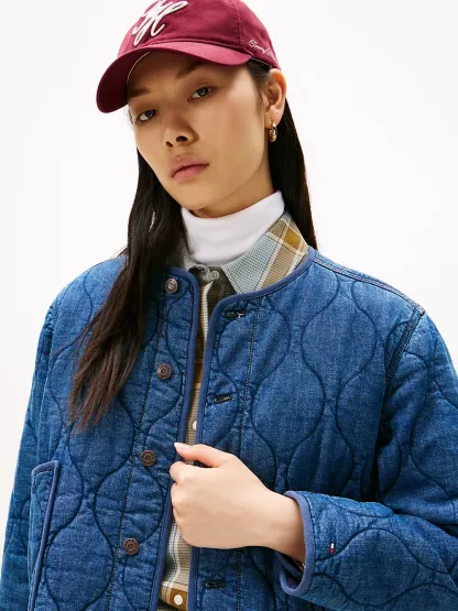 Tommy Hilfiger women's jacket. Our barn jacket is made from durable stretch-cotton denim with a pillowy, quilted texture ideal for the transitional days of the season. This timeless design layers easily over sweaters and tees, and will live in your wardrobe for years.