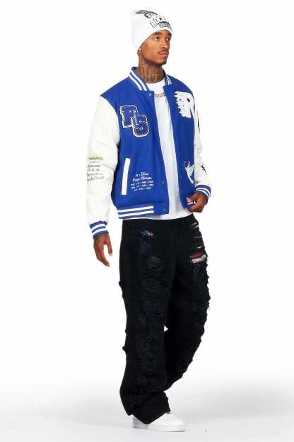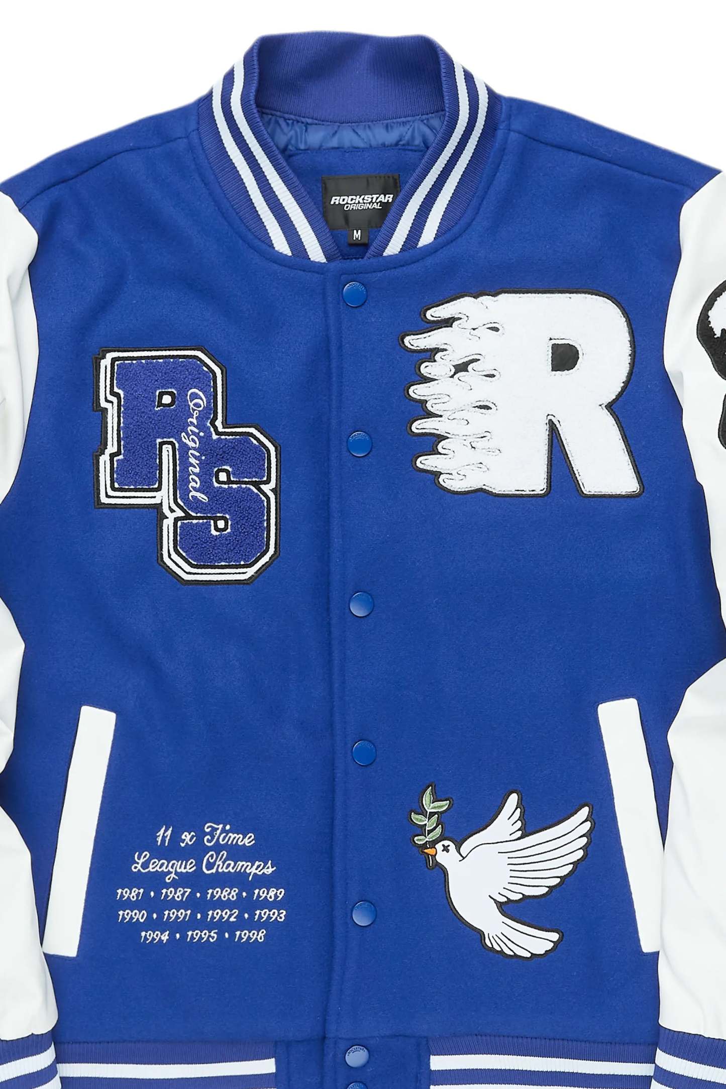 A collegiate varsity jacket for men in royal blue. Designed with an ultra soft fleece body and contrast faux leather sleeves for a dope urban outerwear bomber jacket.