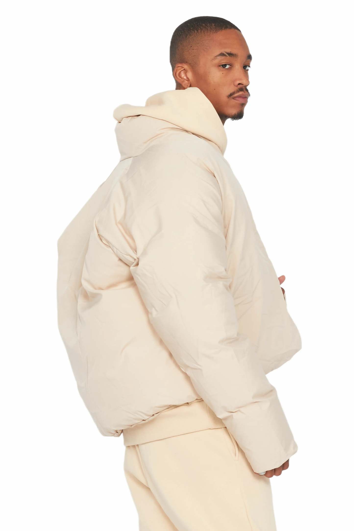 An urban streetwear puffer jacket for men in beige. Designed with highest-quality insulated fabric and water and wind-resistant materials for a must-cop outerwear style.