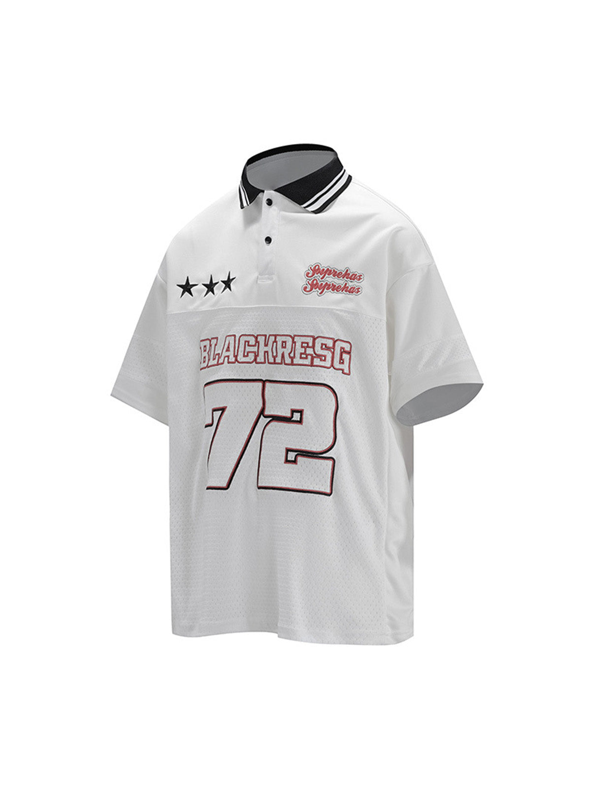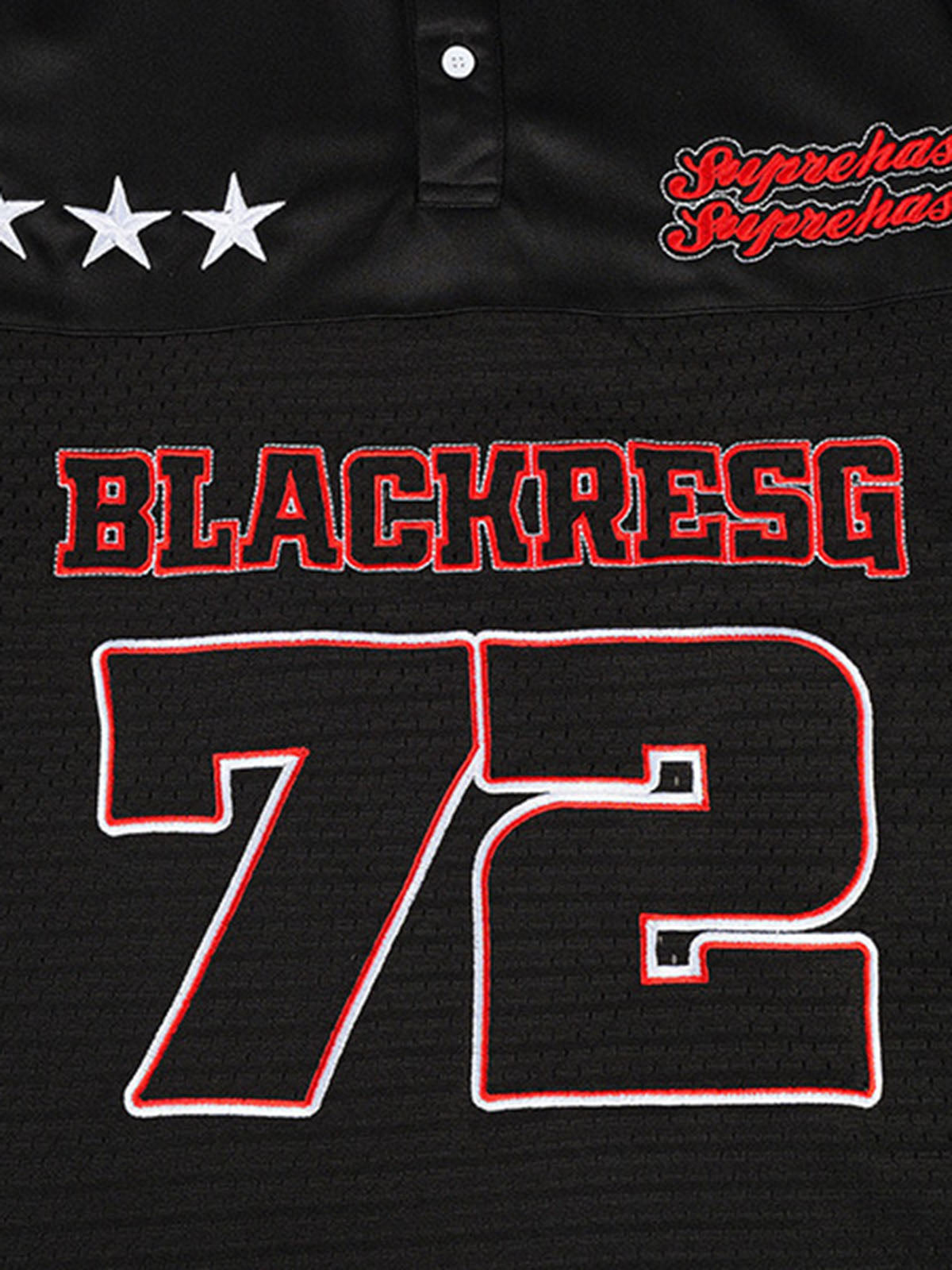 • Design Elements: Embroidered stars and text, mesh paneling, bold number print