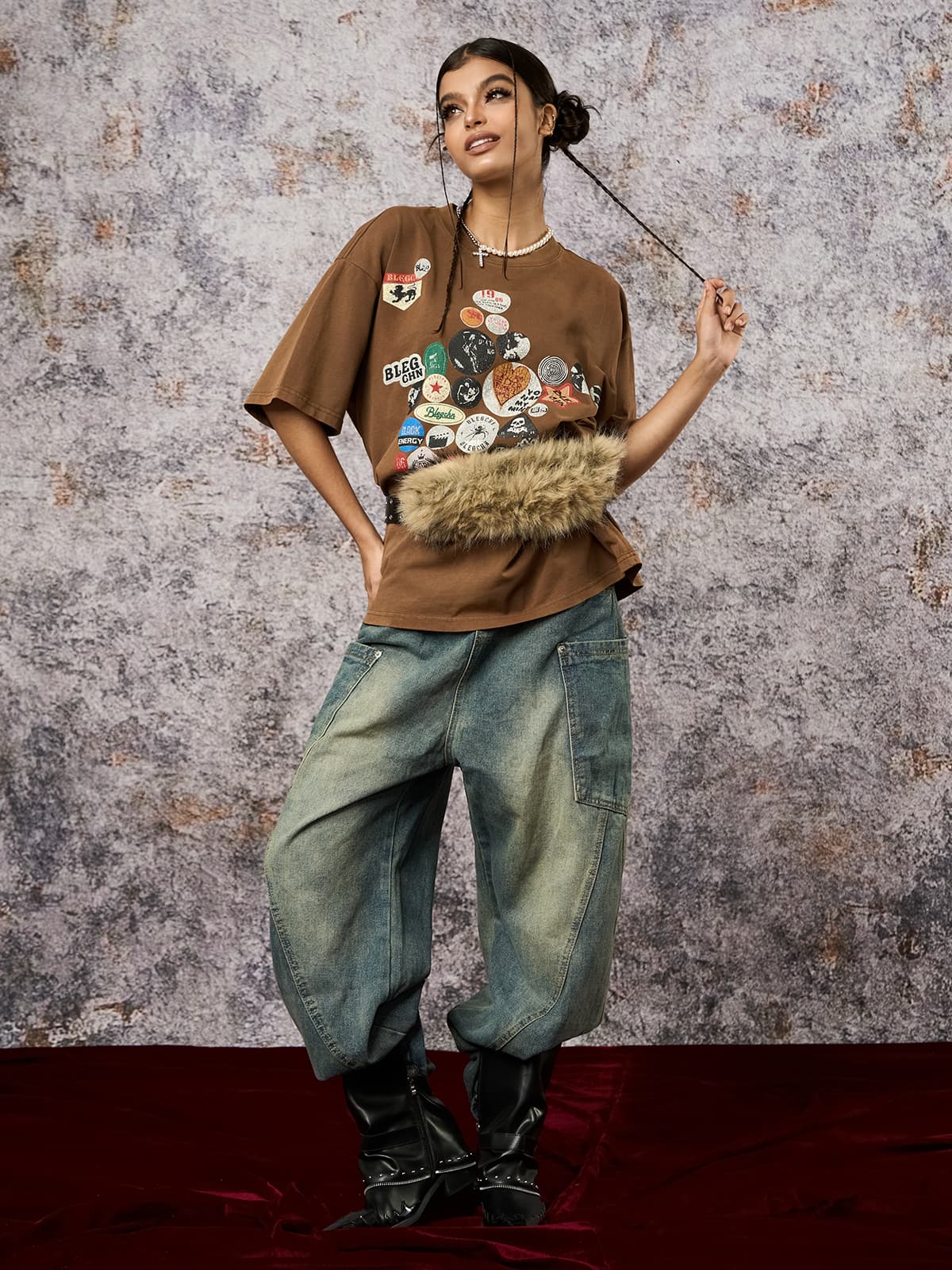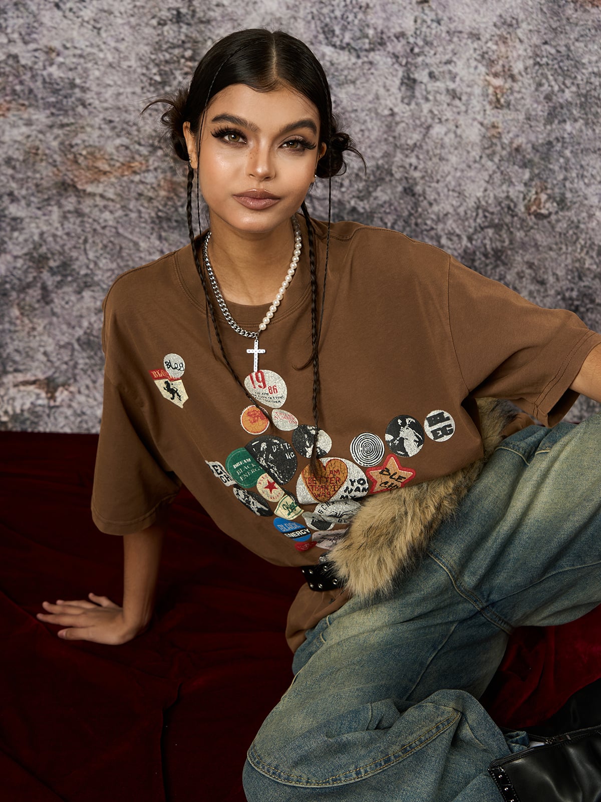 • Design Elements: Vibrant patchwork graphics with various symbols and text designs