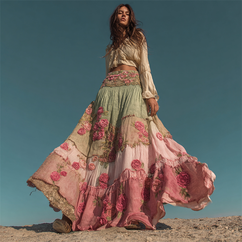 Vintage Boho Pink Rose Textile Patchwork Flowy Linen Wide Skirt