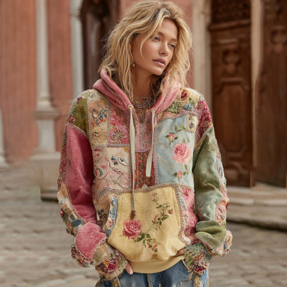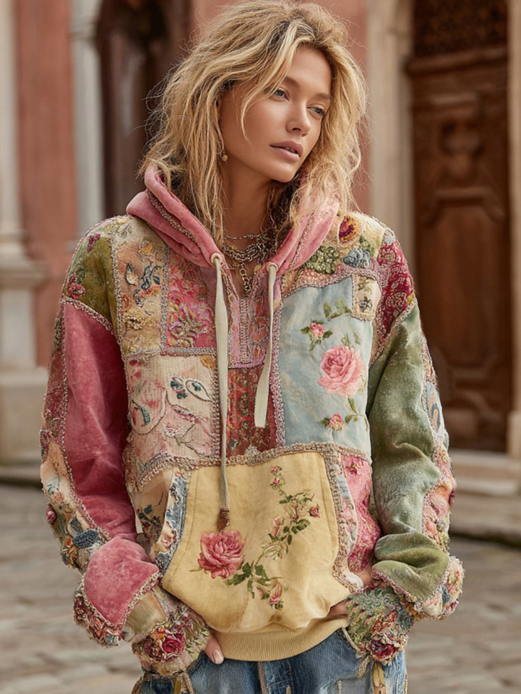 Vintage Rose Floral Embroidery Patchwork Art Casual Hoodie