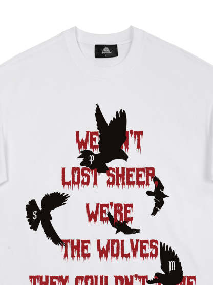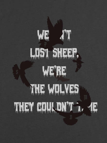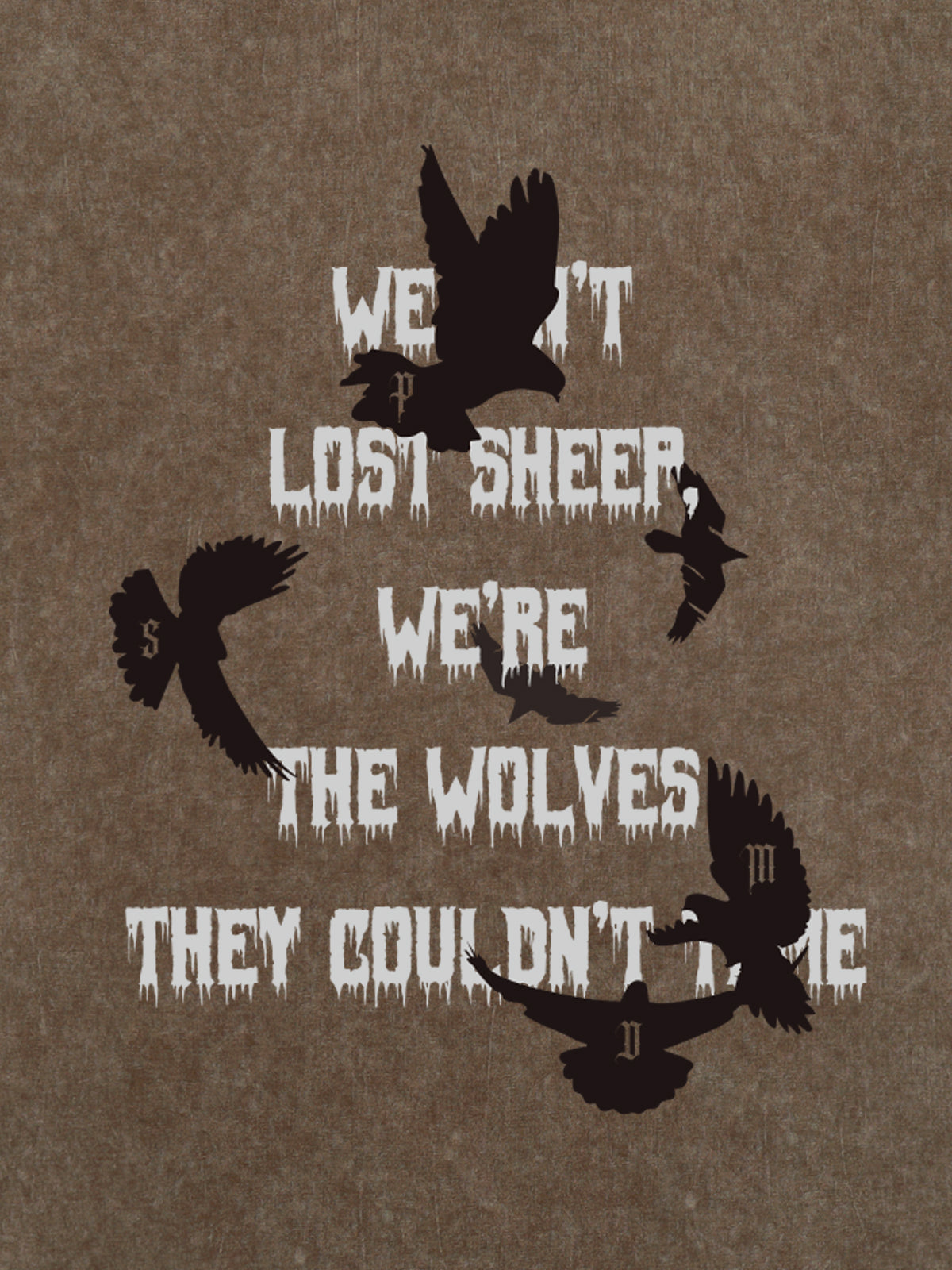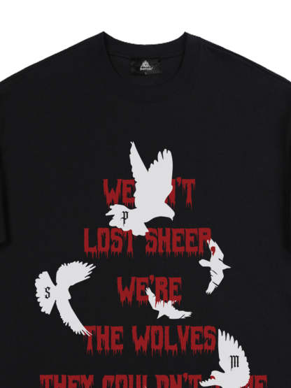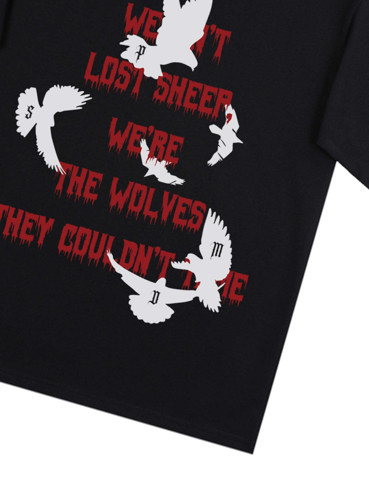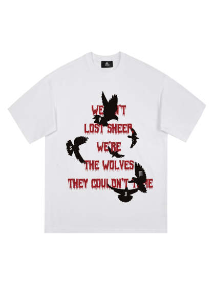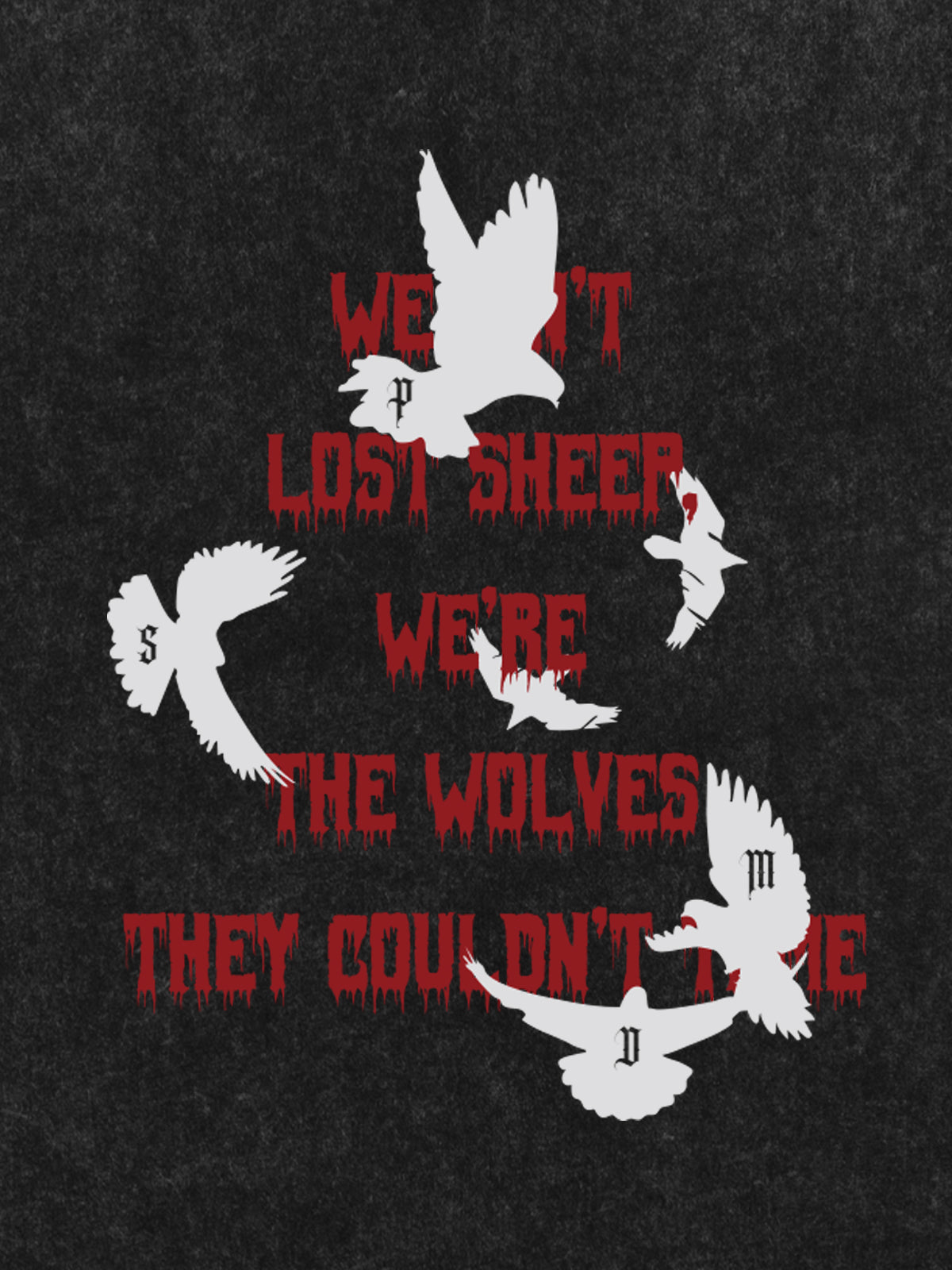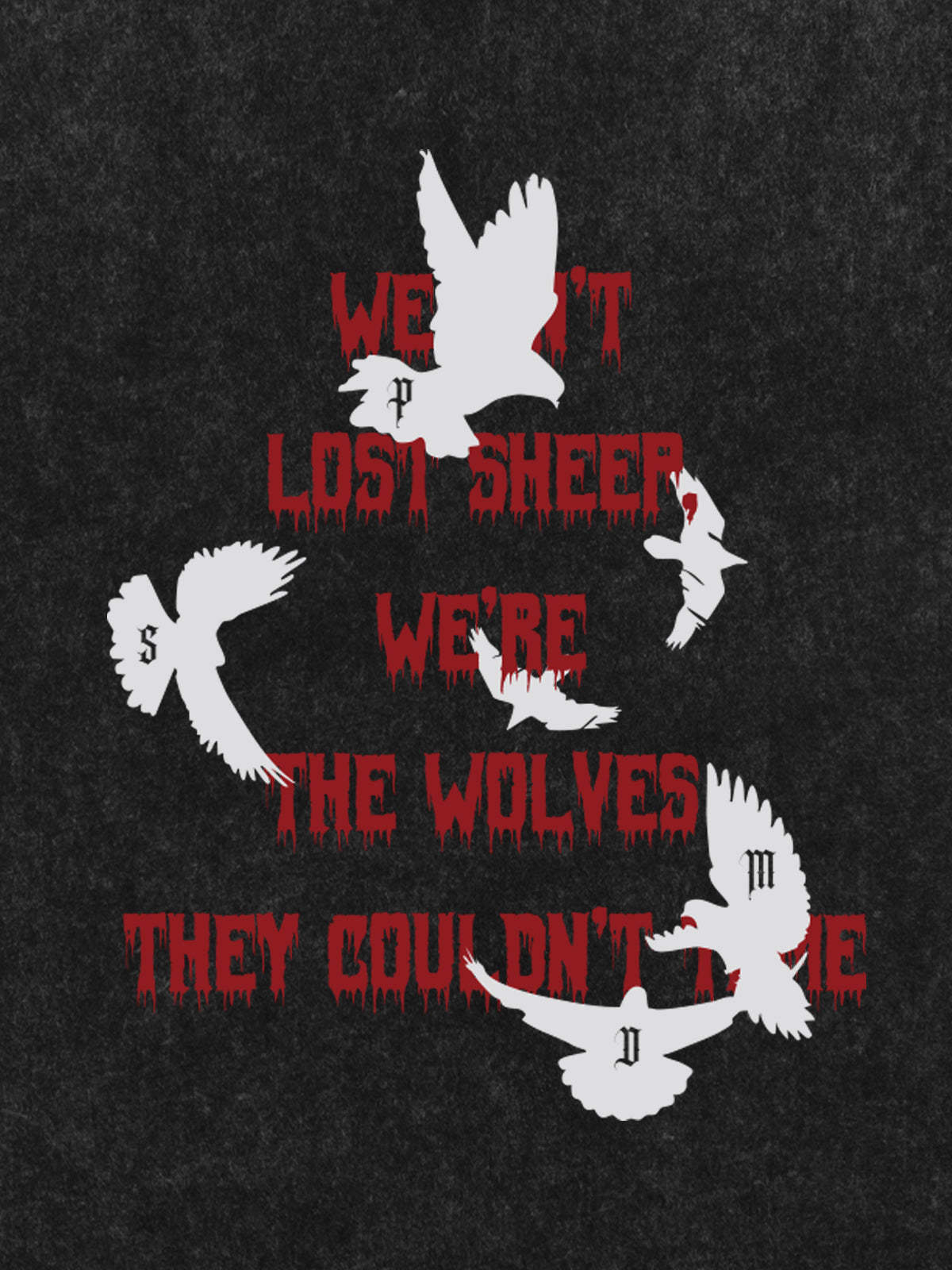 • Design Elements: Distressed red text print, white bird silhouettes, wolf-themed graphic