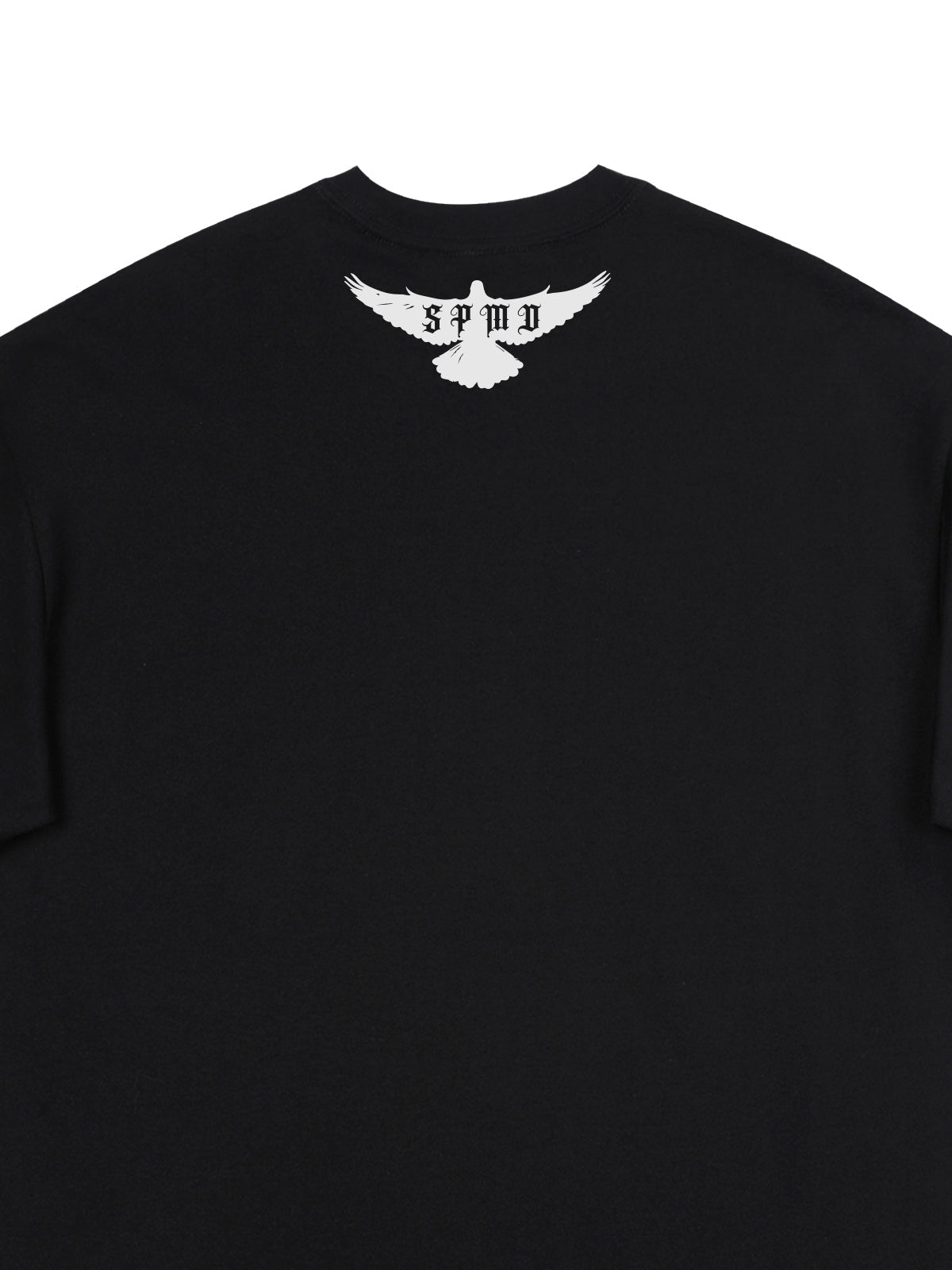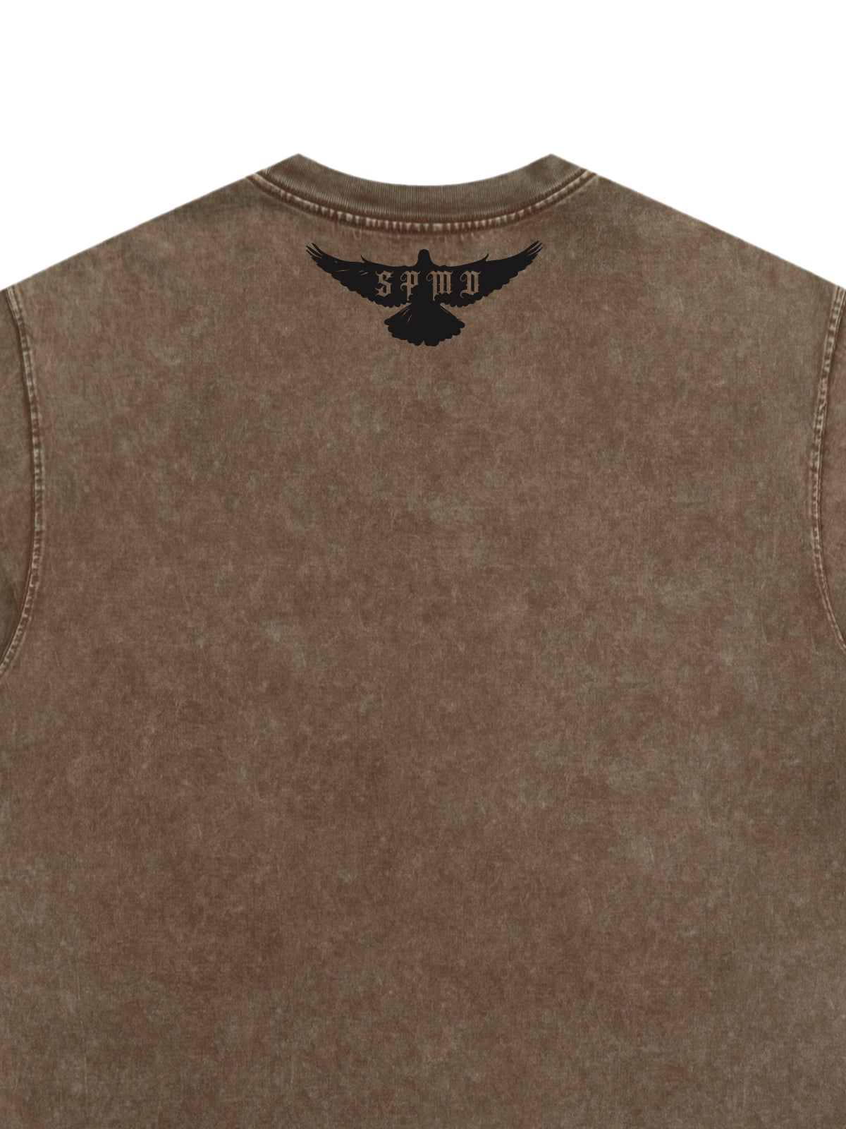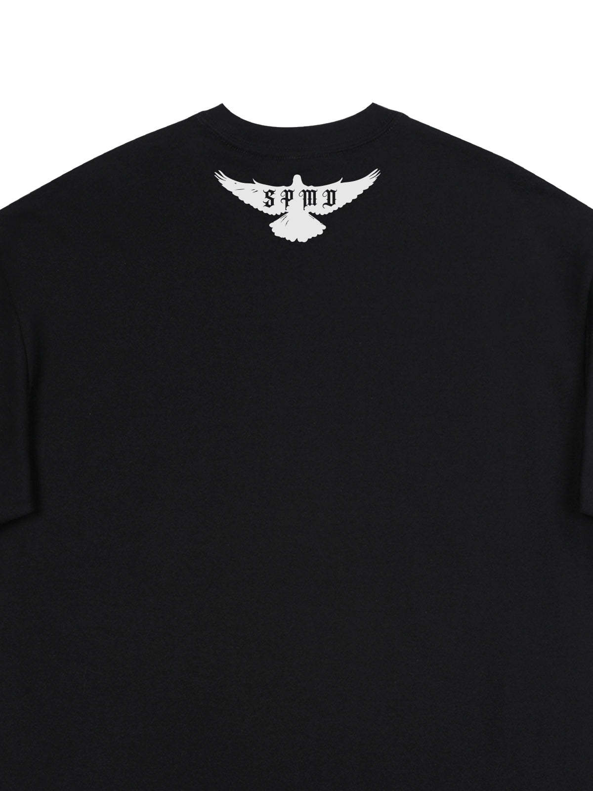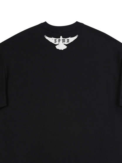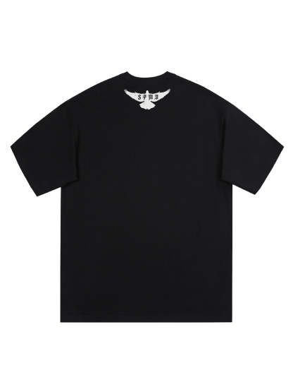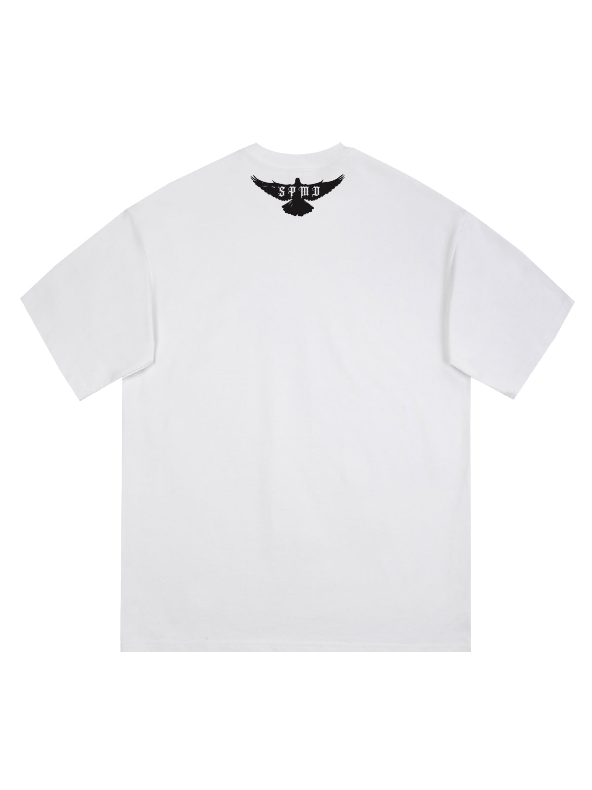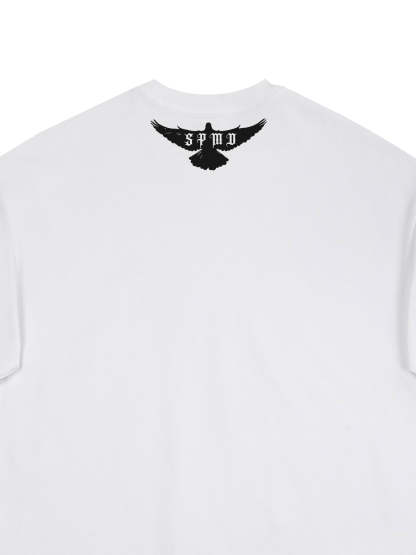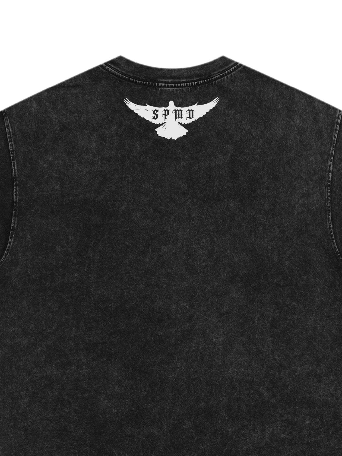 • Design Elements: Distressed red text print, white bird silhouettes, wolf-themed graphic