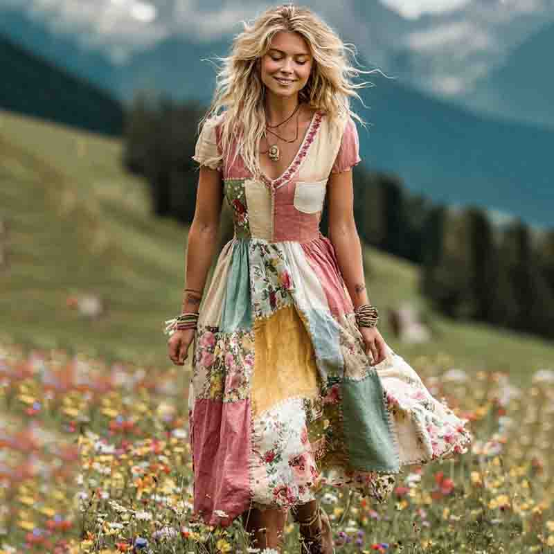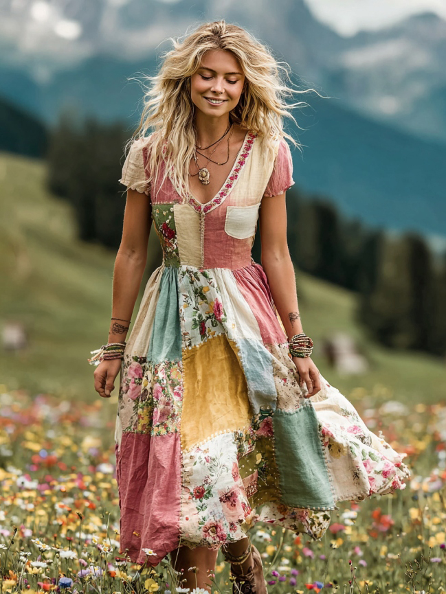 Women's Vintage Floral Art Patch Linen Comfy Short Sleeve Dress
