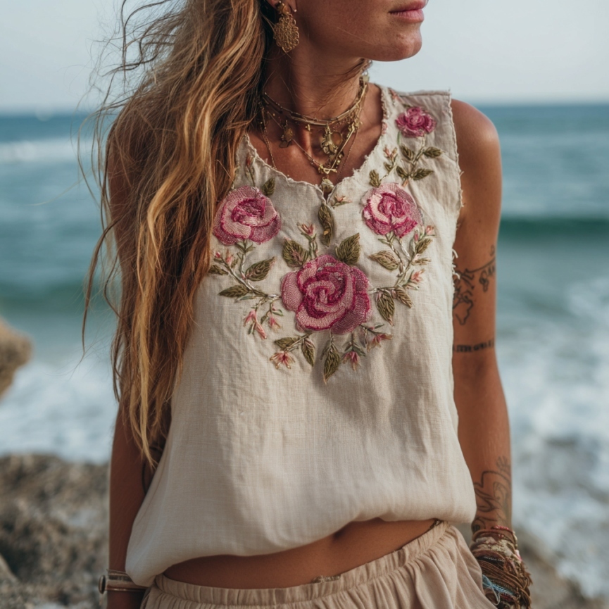 Women's Vintage Floral Embroidery Art Linen Comfy Sleeveless Top